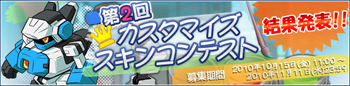 こんにちは、鋼鉄戦記C21運営チームです。大変長らくお待たせいたしました! 2010年10 月15日(金)11:00 ~ 11月11日(木)23:59に開催いたしました 「第2回カスタマイズスキンコンテスト」ですが、 応募作品数が496作品と、非常に多くの作品が集まりました。 様々なパーツ達が用いられて完成されたロボは体型も雰囲気も、正に千差万別といった雰囲気でした。 その中でも、オーラ機能を搭載したロボなど、新しいパーツを盛り込んだ意欲的な作品が目を引きます。 特に募集期間中に発売されたばかりのバンガードフェンサーが組み込まれた作品も見られ、 審査員を唸らせました。 どれも素晴らしい作品の為、選考は難航を極めましたが、ついに受賞作品が決定しました! 果たして最優秀賞の栄冠は誰のものとなるのでしょうか!? それでは、第2回カスタマイズスキンコンテストの結果を発表いたします!